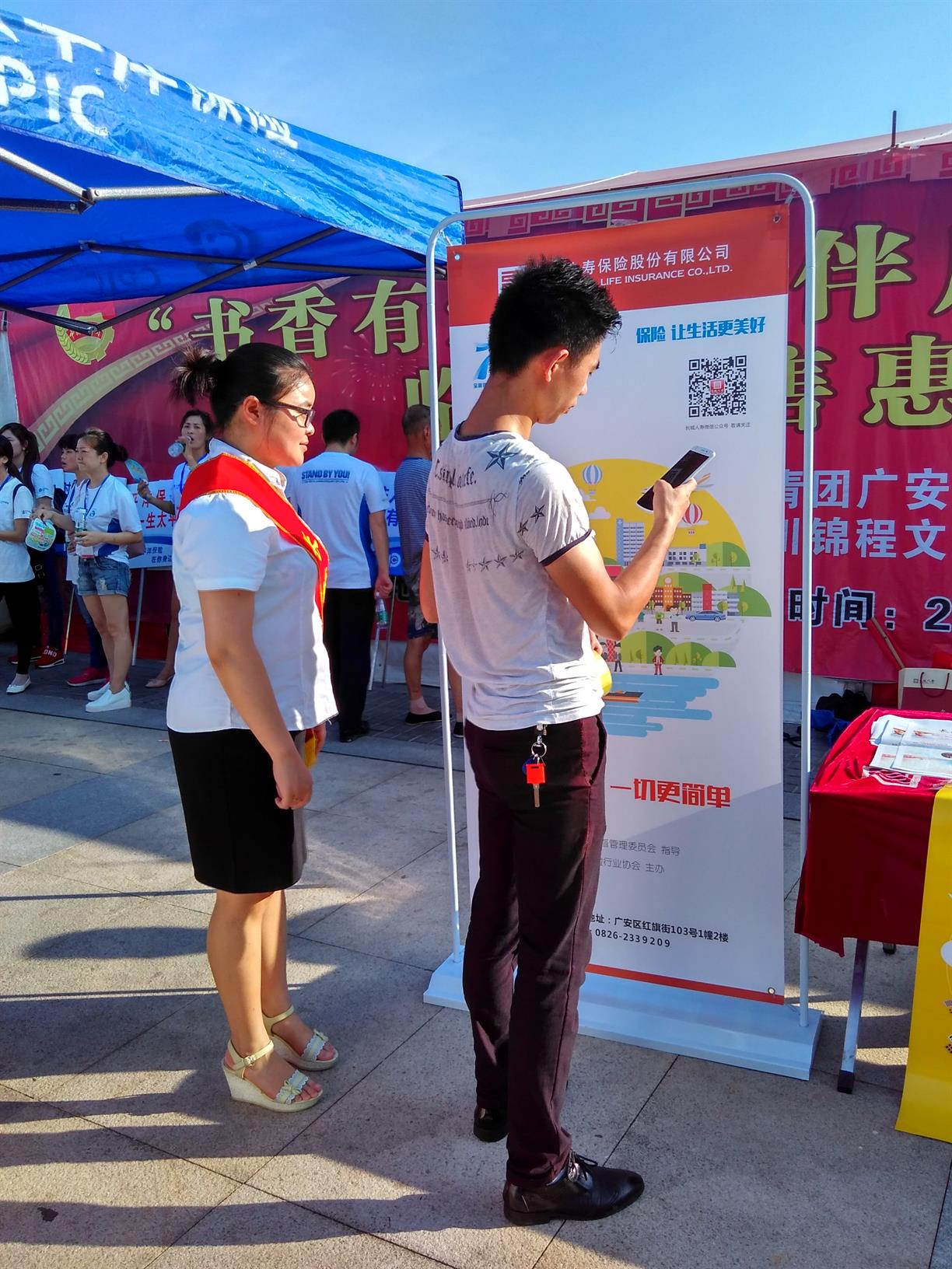 為了方便市民了解保險知識,長城人壽廣安中支設立了宣傳展臺、擺放了印有公司微信二維碼的展架,向市民分發(fā)了保險知識彩頁、《長城保險報》等宣傳品?;顒舆M行中,有不少市民前來咨詢保險產(chǎn)品,或直接掃描長城人壽官方二維碼了解公司信息。廣安市政府和行業(yè)協(xié)會的領導還特意來到長城人壽廣安中支的展臺前參觀指導,了解公司的服務特色及發(fā)展狀況。