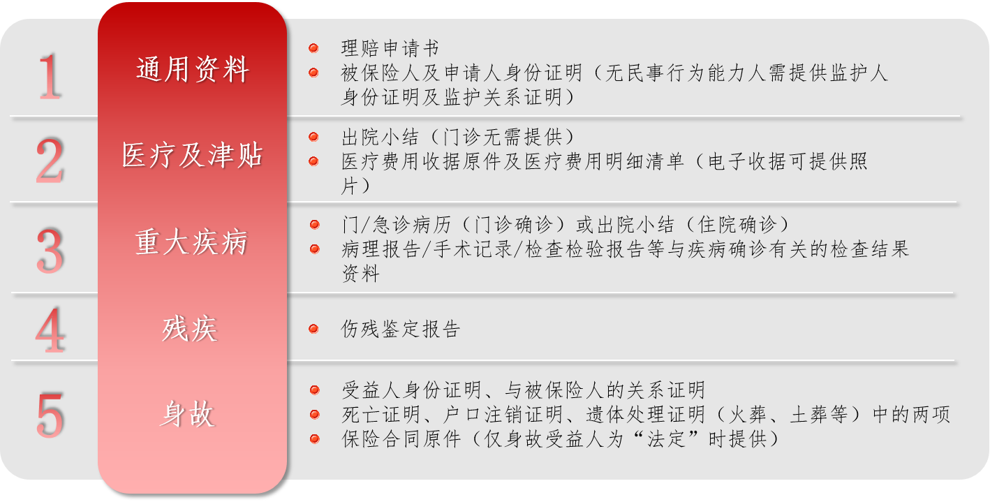 溫馨提示:當(dāng)上述應(yīng)備材料不足以證明理賠事項(xiàng)時(shí),我們將要求您繼續(xù)補(bǔ)充相關(guān)理賠申請(qǐng)材料。