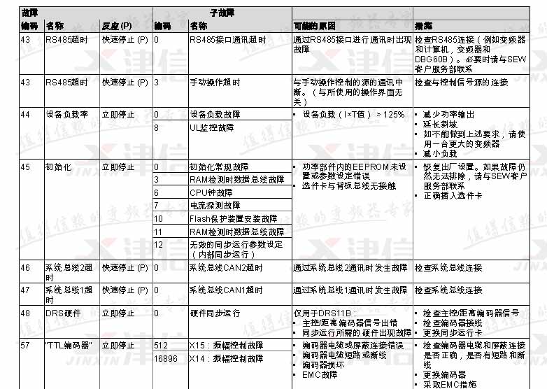 SEW變頻器故障代碼F43,F(xiàn)44,F(xiàn)45,F(xiàn)46,F(xiàn)47,F(xiàn)48,F(xiàn)57,具體如下: