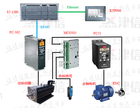 PLC與觸摸屏之間進(jìn)行Ethernet通訊,PLC與丹佛斯FC302變頻器之間進(jìn)行RS485通信,通過(guò)觸摸屏可以設(shè)置標(biāo)長(zhǎng)、對(duì)標(biāo)位置、出標(biāo)起始位置等工藝參數(shù);FC302變頻器控制出標(biāo)伺服電機(jī),以保證出標(biāo)精度及響應(yīng)精度。