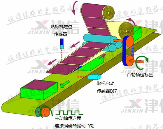 凸輪軸接收來自主軸的脈沖信號,依主軸節(jié)奏進行貼標(biāo)動作,傳送標(biāo)簽時需很準(zhǔn)確平穩(wěn),在粘貼標(biāo)簽時,必須要能穩(wěn)定控制運行速度與主軸同步,否則標(biāo)簽貼起來會不平順。